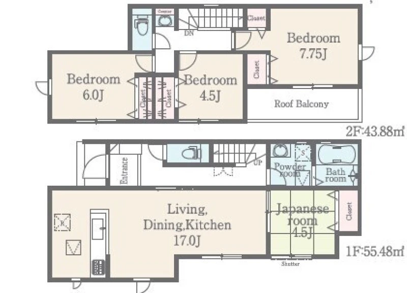 | 設備 | 都市ガス、電気、上水道、下水道、システムキッチン、給湯、トイレ2箇所、温水洗浄便座、フローリング、複層ガラス、ルーフバルコニー、収納スペース、床下収納、ディンプルキー、モニタ付インターホン、火災警報器等設置済、建設住宅性能評価取得(予定含む) | ||