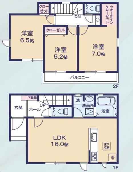 | 設備 | プロパンガス、電気、上水道、下水道、システムキッチン、浄水器、給湯、トイレ2箇所、温水洗浄便座、浴室乾燥機、フローリング、複層ガラス、収納スペース、ウォークインクローゼット、床下収納、宅配ボックス、駐車2台可、ディンプルキー、モニタ付インターホン、火災警報器等設置済、建設住宅性能評価取得(予定含む) | ||