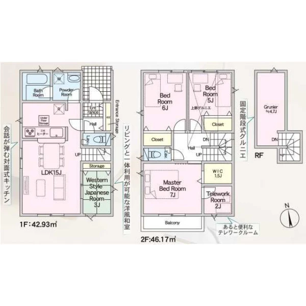 | 設備 | ガスその他、電気、上水道、下水道、システムキッチン、カウンターキッチン、浄水器、IHクッキングヒーター、給湯、トイレ2箇所、温水洗浄便座、シャンプードレッサー、浴室乾燥機、グルニエ、フローリング、複層ガラス、オール電化、収納スペース、ウォークインクローゼット、床下収納、駐車2台可、モニタ付インターホン、火災警報器等設置済 | ||