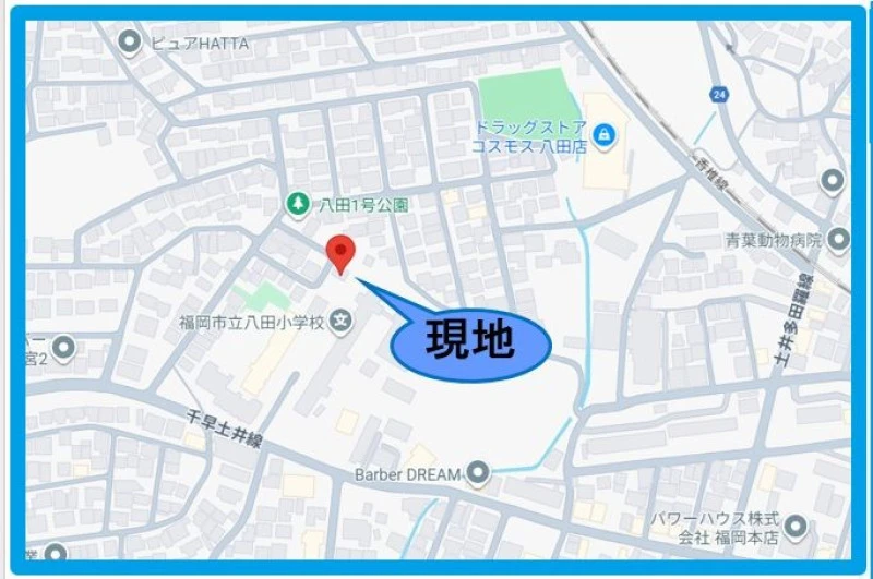 ※地図上の「対象地」は「福岡県福岡市東区八田2丁目 」付近を示しています。実際の場所ではない場合がございます。詳しくはお問い合わせください。