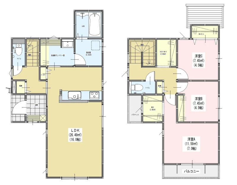 | 設備 | 都市ガス、電気、上水道、下水道、側溝、システムキッチン、カウンターキッチン、食器洗浄乾燥機、追焚機能、トイレ2箇所、温水洗浄便座、浴室乾燥機、複層ガラス、床下収納、駐車2台可、モニタ付インターホン、火災警報器等設置済、都市ガス、上水道、下水道、側溝、省エネ給湯器、電気 | ||