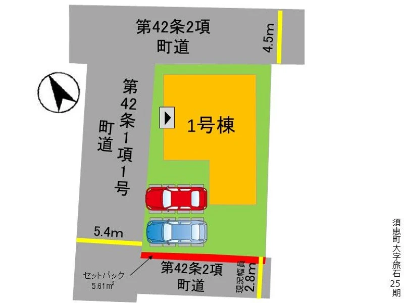 三方 北東 間口9.6m 公道 幅4.5m 北西 間口15.6m 公道 幅5.4m |