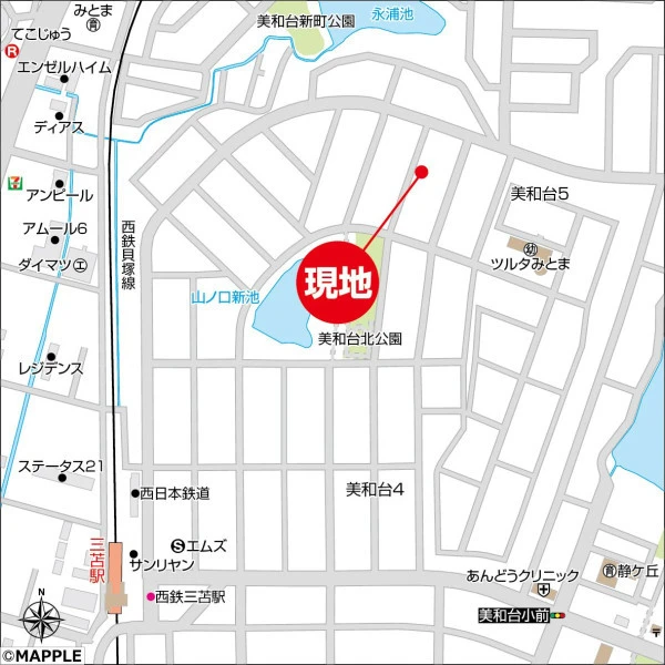 ※地図上の「対象地」は「福岡県福岡市東区美和台5丁目 」付近を示しています。実際の場所ではない場合がございます。詳しくはお問い合わせください。