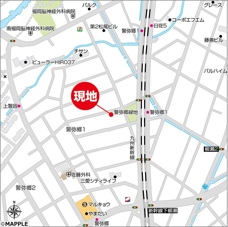 ※地図上の「対象地」は「福岡県福岡市南区警弥郷1丁目 」付近を示しています。実際の場所ではない場合がございます。詳しくはお問い合わせください。