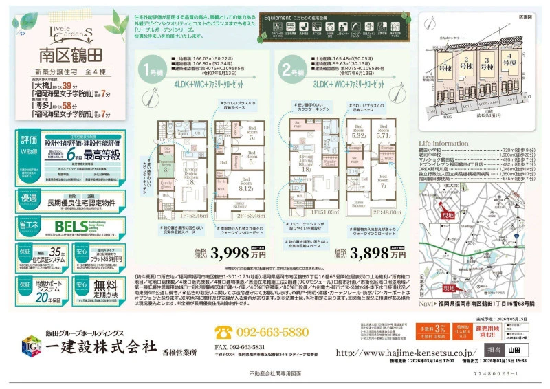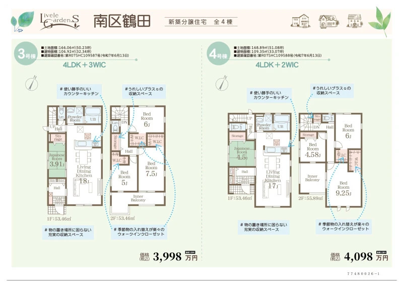 | 設備 | 都市ガス、電気、上水道、下水道、側溝、システムキッチン、トイレ2箇所、浴室乾燥機、複層ガラス、ウォークインクローゼット、床下収納、駐車3台以上可、都市ガス、上水道、下水道、側溝、省エネ給湯器、電気 | ||